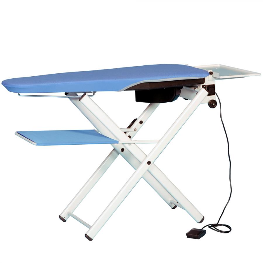 Een gemakkelijk te bedienen pedaal regelt de zuigventilator die de kleding onmiddellijk droogt nadat het door het stoomstrijkijzer is gedrukt. Een verwarmingsapparaat houdt de strijktafel perfect droog.